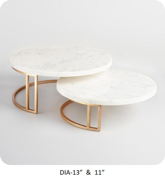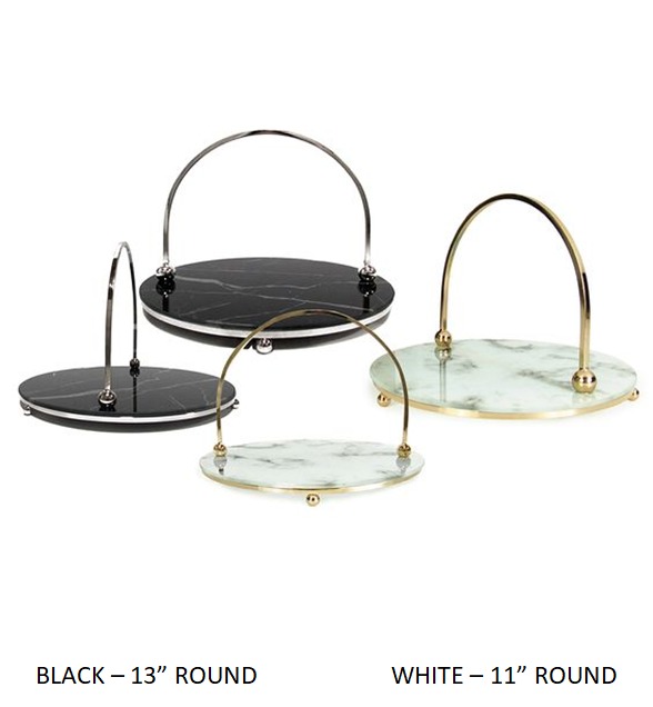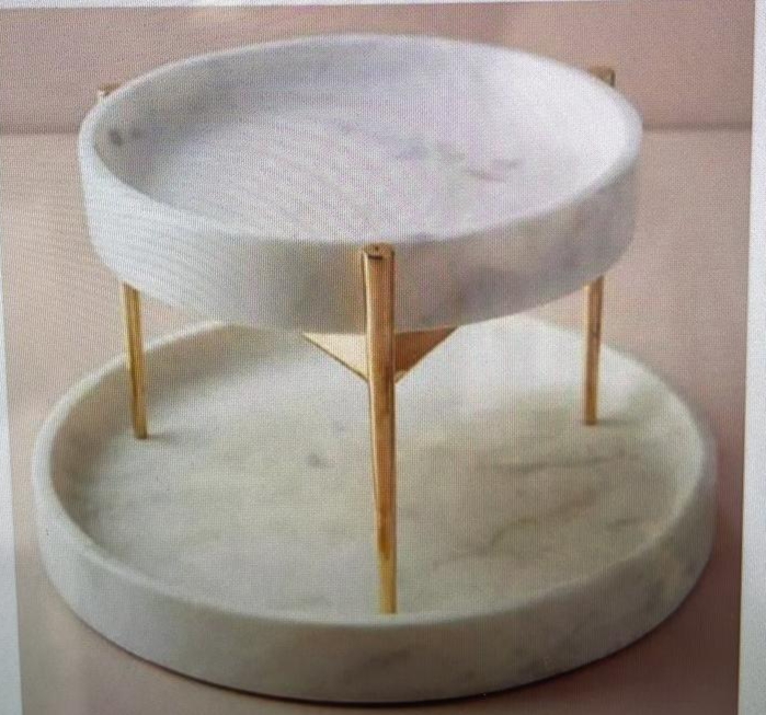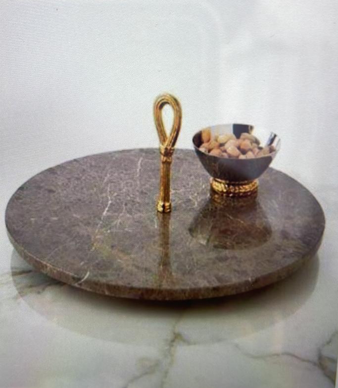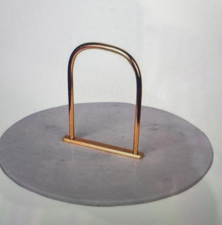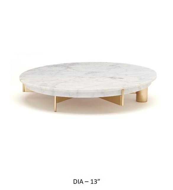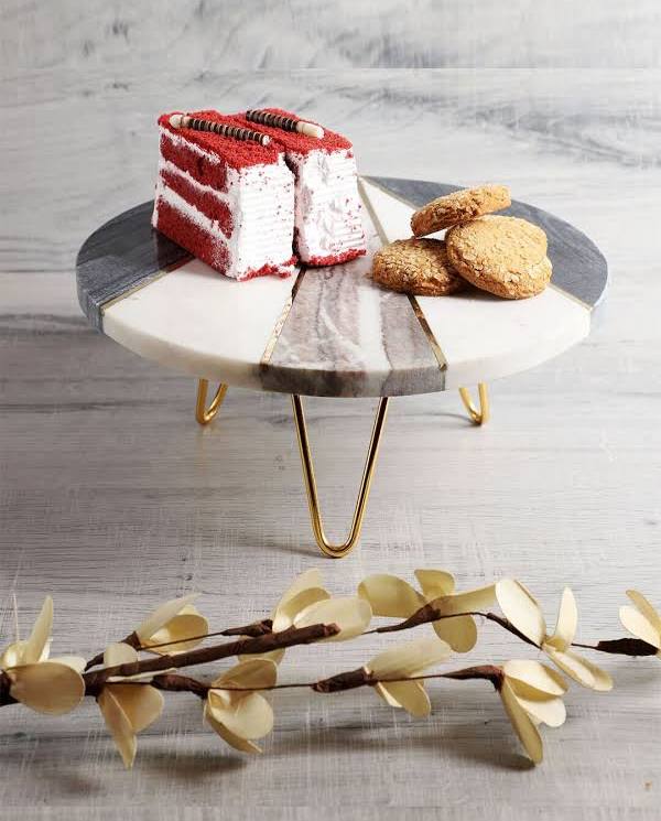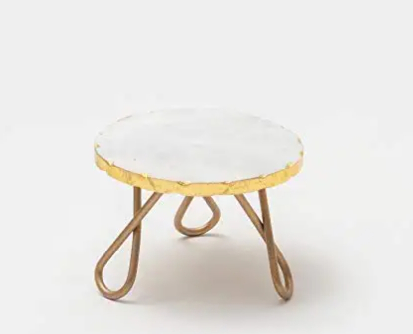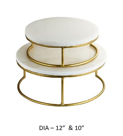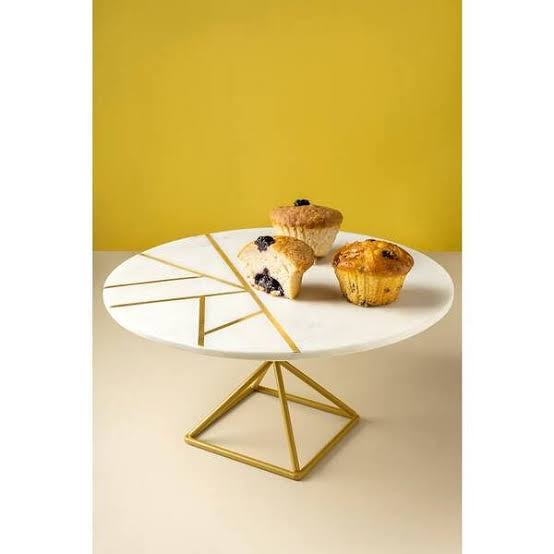 A functional yet elegant round cake display stand hand crafted with a unique blend of exquisite white marble (color option of green and yellow marble and many more) and having the elegant golden metal base.